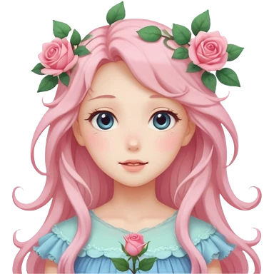 Gorgeous pastel anime lady with roses in long hair and pink dress with blue eyes emoji