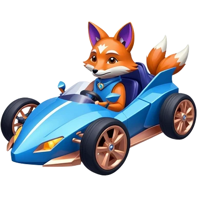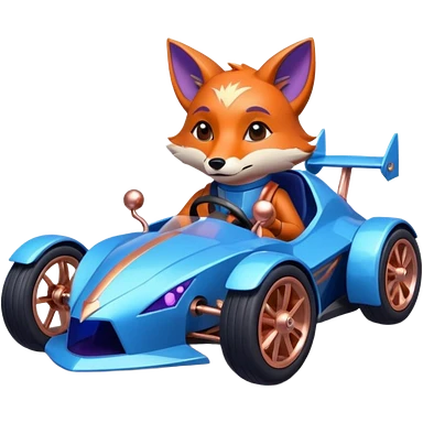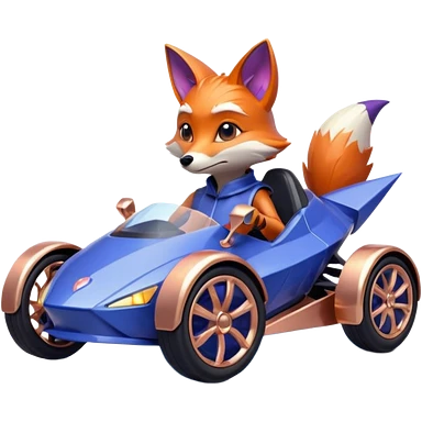 dark crystal blueberry and rosegold-accented cyber faceted-body electric racing car driven by a small cute but relaxed fox with rear spoiler, roll bar, and wheely bar emoji