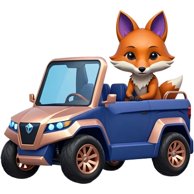 dark crystal blueberry and rosegold-accented cyber truck style-faceted-body electric racing car driven by a small cute but relaxed fox with rear spoiler, roll bar, and wheely bar emoji