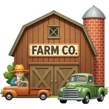 "1940s farm business emoji: a wooden barn with a brick silo, a classic Ford truck, a hand-lettered 'FARM CO.' sign, simplified vector style, vintage colors, transparent background." emoji