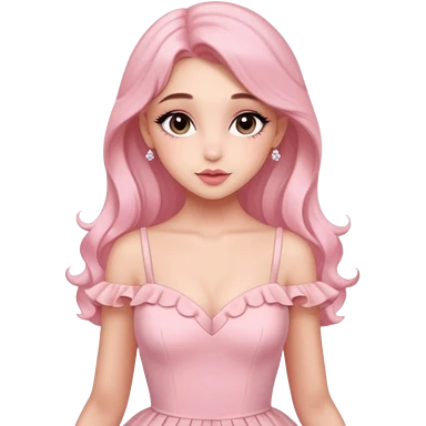 white or light brown girl with bangs, long light brown hair with curly blonde highlights, wearing a pastel pink dress with puff sleeves emoji