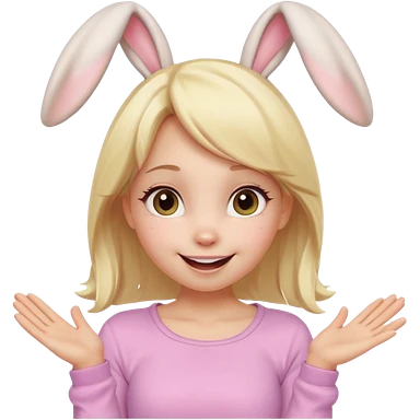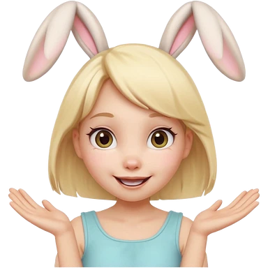 A playful blonde female cartoon character with wide, mischievous eyes, smiling, bunny ears accessory, dynamic pose suggesting movement, pastel colors, minimalistic and cute emoji style. emoji