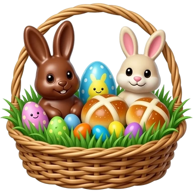 Detailed 3D iOS emoji icon. Wicker English Easter basket. Content: green grass, large solid chocolate bunny, Peeps, Jelly Beans, pastel Mini Eggs, two Hot Cross Buns. Featuring: plastic egg with surprise, plush bunny. emoji