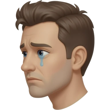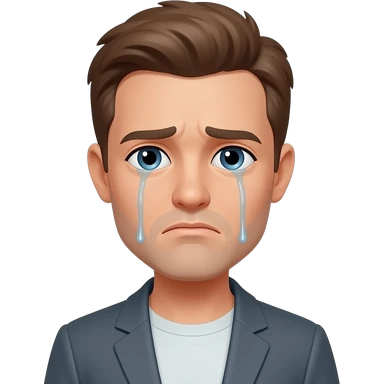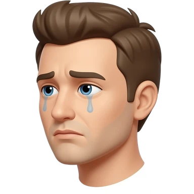 portrait of a sad clown emoji, white face paint, red nose, minimalist makeup with drooping eyebrows and frown, visible tears under the eyes, short curly pastel blue hair, simple ruffled collar, soft subdued colors, glossy highlights, centered close-up, white background emoji