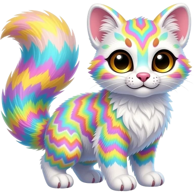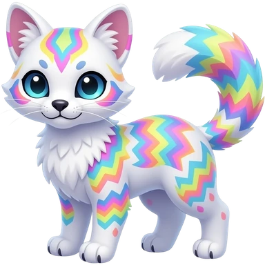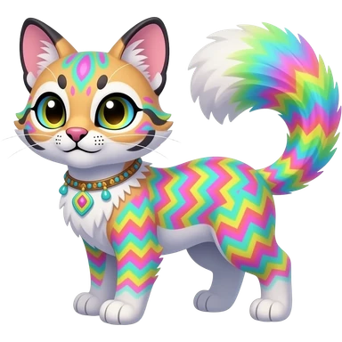 Colorful tropical tribal pale light fruity pastel white glorious iridescent divine exotic cute albino neon vibrant zigzagged cool beautiful fantasy-caracal-civet-genet-sergal-vernid-Gryphon-Cacomistle-Trico-oncilla-animal-Fakémon-hybrid-fursona (full body), facial markings, emoji