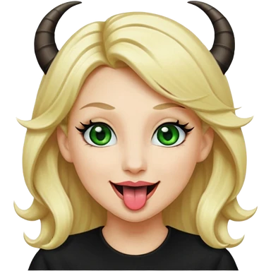 Emoji femme blonde habillée en noir cheveux blond, yeux vert avec de long cils noir qui tire la langue et à des cornes emoji