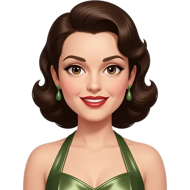 Maxene Andrews from The Andrews Sisters with brown eyes, long black hair, olive eyeshadow, red lipstick, olive metallic off shoulder dress, silver necklace and earrings emoji