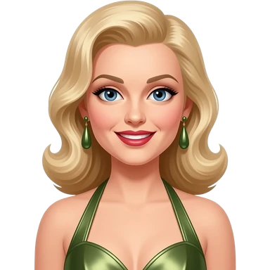 Patty Andrews from The Andrews Sisters with dark blue eyes, long blonde 40s victory roll hair, olive metallic halter dress, olive earrings emoji | AI Emoji Generator