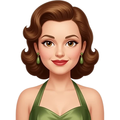 Maxene Andrews from The Andrews Sisters with brown eyes, long brunette hair, white eyeshadow, red lipstick, olive green metallic off shoulder dress, silver necklace and earrings emoji