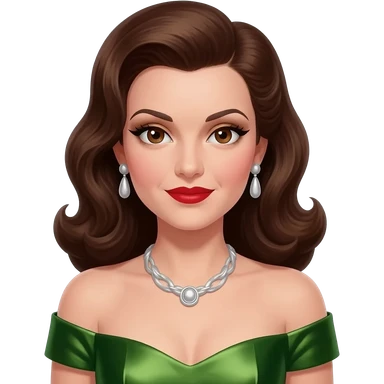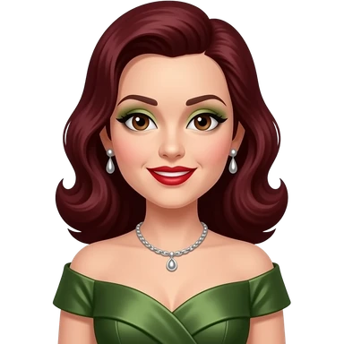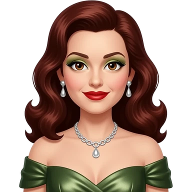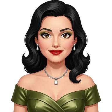Maxene Andrews from The Andrews Sisters with brown eyes, long black hair, olive eyeshadow, red lipstick, olive metallic off shoulder dress, silver necklace and earrings emoji