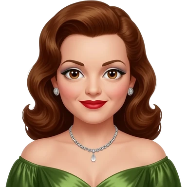 Maxene Andrews from The Andrews Sisters with brown eyes, long brunette hair, white eyeshadow, red lipstick, olive green metallic off shoulder dress, silver necklace and earrings emoji