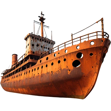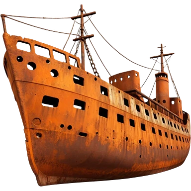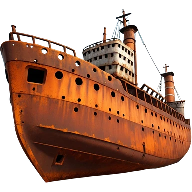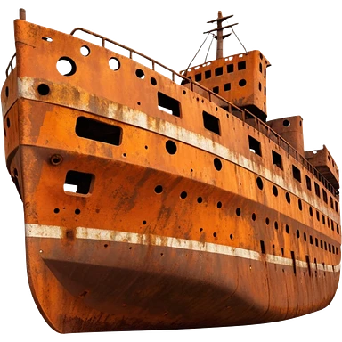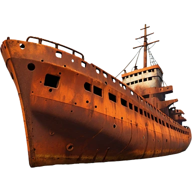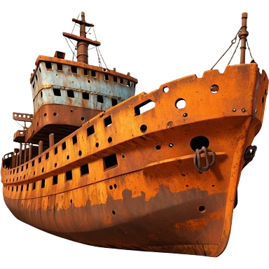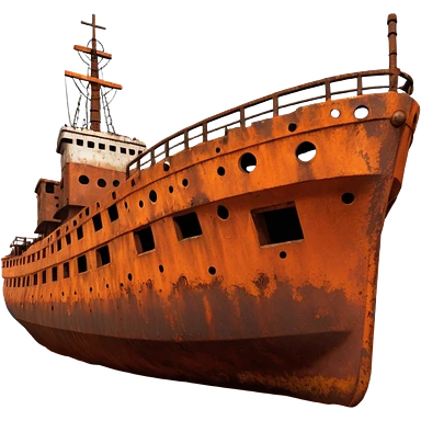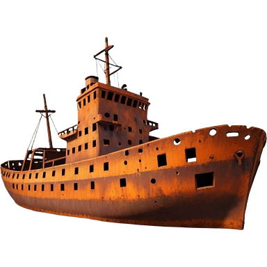 rusted ship wreck, heavily corroded metal hull, orange-brown rust textures, abandoned old ship, weathered surface, dramatic lighting, cinematic atmosphere, 3D cartoon style, mobile game environment art, clean composition, no people, no text, no watermark emoji