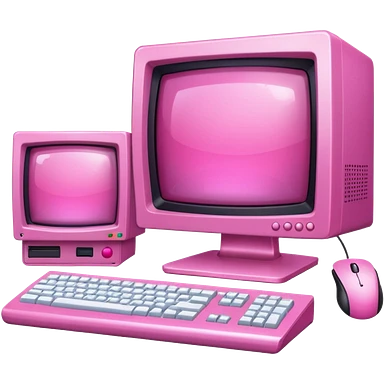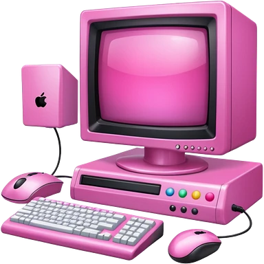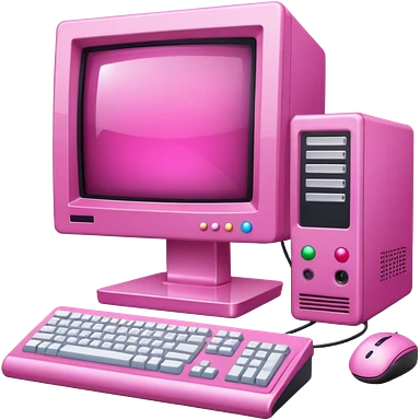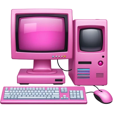 shiny pink translucent 90s computer with CRT monitor, keyboard, PC tower, mouse emoji