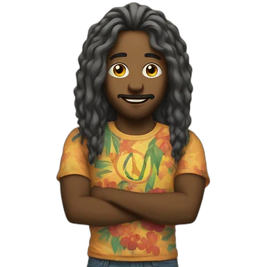 happy woman, black straight hair, light skin color, orange t-shirt, do it peace and love simbol with her hands emoji