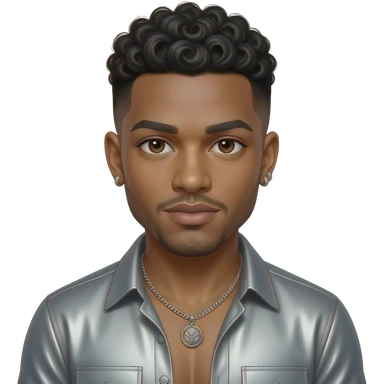 Ricky Bell from New Edition with dark brown eyes, black curly high top fade hair, grey metallic shirt, shirtless with necklace and earrings emoji