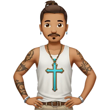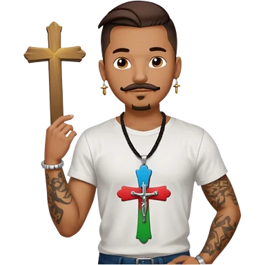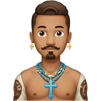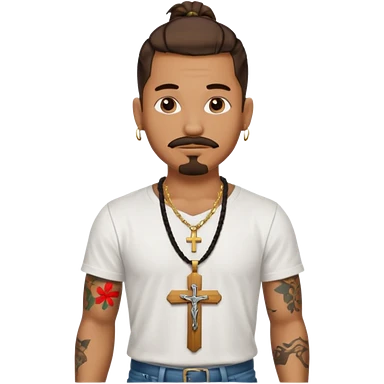Deci creează mi un emoticon cu un băiat mai creol care are doar o coadă are cercel intr o ureche are tatuaje și barba cioc și mustața și are lanț la gât cu cruce vreau să fie cu totul cu tot cu corp și cercel vreau să aibă doar intr o ureche nu în ambele emoji