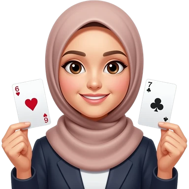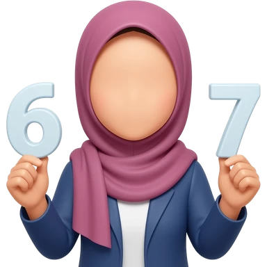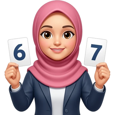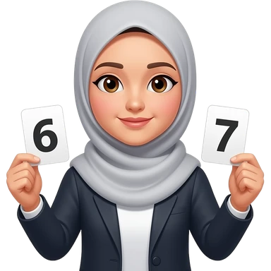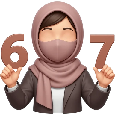 asian hijabi woman holding 6 in one hand and 7 in the other hand. no eyes emoji