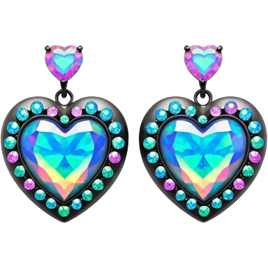 Hyperrealistic, ultra detailed, dark with multidimensional sparkle and multicolor, black opal gemstones heart shaped, 10k earrings. Isolated, 3D rendering. emoji