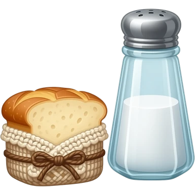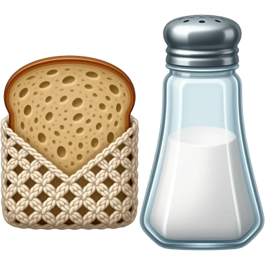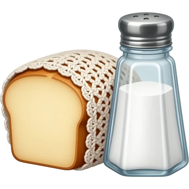a small cut-out peasant bread wrapped in crocheted fabric, next to which stands a large glass salt shaker emoji