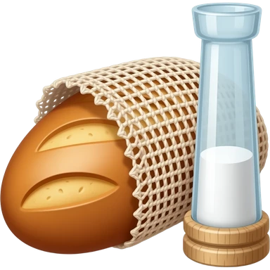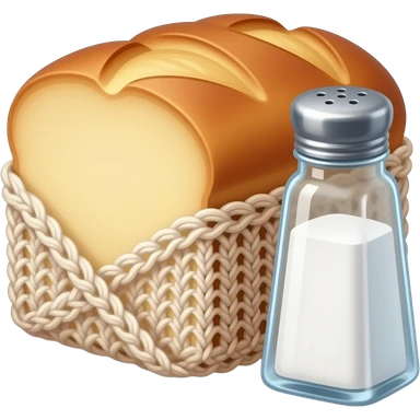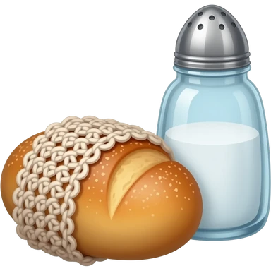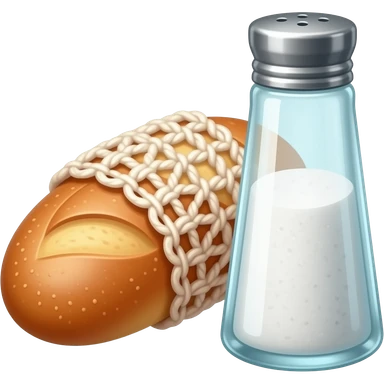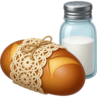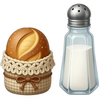 peasant bread wrapped in crocheted cloth with a glass salt shaker next to it emoji | AI Emoji Generator