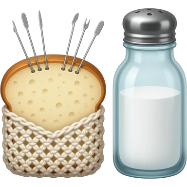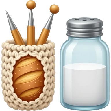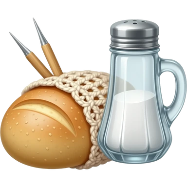 a small cut-out peasant bread wrapped in crocheted fabric with crochet needles sticking out, next to which stands a large glass salt shaker emoji