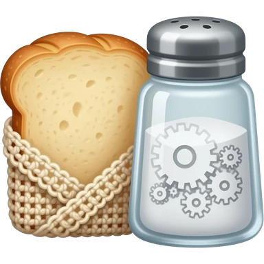 steampunk style - a small cut-out peasant bread wrapped in crocheted fabric, next to which stands a large glass salt shaker emoji