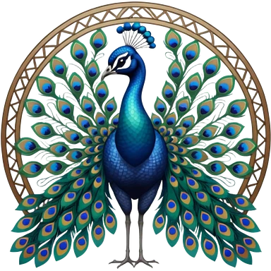 Must be 4k hd quailty, must have no emoji faces, must have no emoji icons, must have no human figures. Art Nouveau poster design featuring a peacock with iridescent feathers spreading into intricate geometric patterns emoji