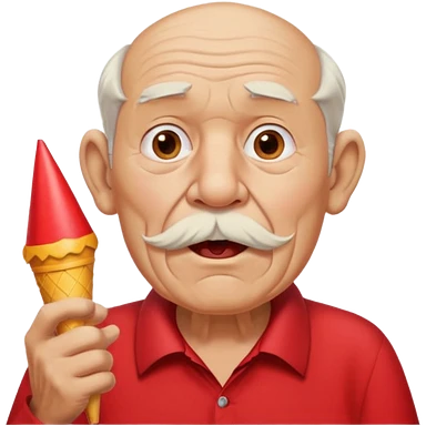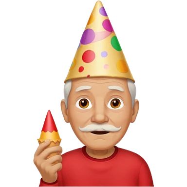 old man with red shirt and birthday cone, party horn on his mouth emoji