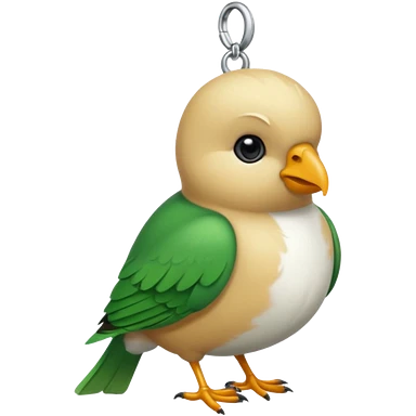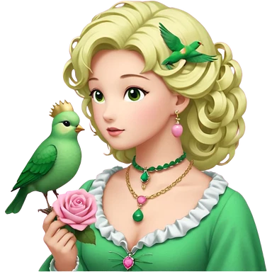 un oiseau classique vert avec un collier autour de son coup avec des breloque argentées et un seul poil blond qui fait une petite bouclette sur le front emoji