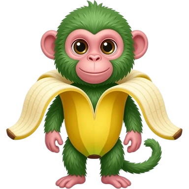 An iOS style emoji of the following: A green-furred monkey with pink facial features (ears, face, and lips) emerging from a peeled yellow banana. The banana peel wraps around the monkey's body like a costume or shell. emoji
