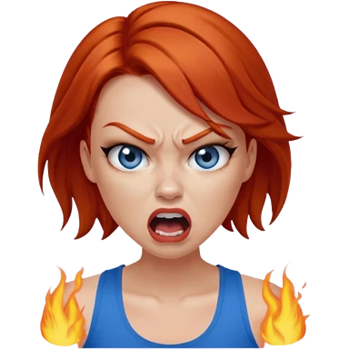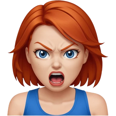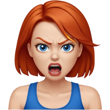 mujer pelirroja con los ojos y los labios maquillados enojada gritando con musculosa azul emoji