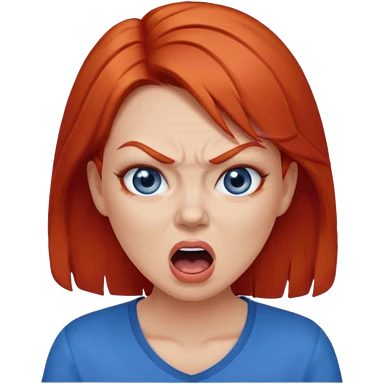 mujer pelirroja con los ojos y los labios maquillados enojada gritando con remera azul emoji
