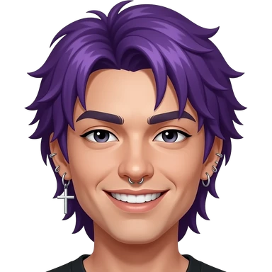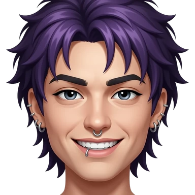 piercings en la nariz el labio, aretes brillantes las orejas, uno colgante en forma de cruz. ojos negros entrecerrados, cejas gruesas, sonrisa ladeada mostrando dientes, y pequeños tatuajes en la cara (como cruz, corona y corazón roto). emoji | AI Emoji Generator