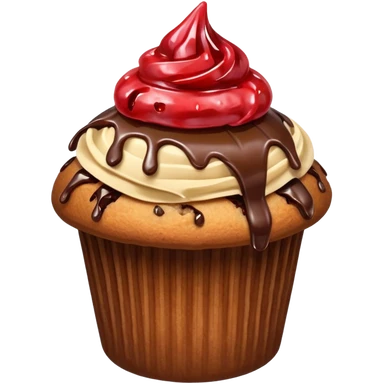 a coffee colored muffin with a wrapper and strawberry jam flowing out the top with pieces of chocolate slowly melting emoji