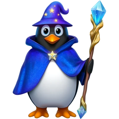 penguin wizard with magical staff wearing a wizard hat fantasy emoji
