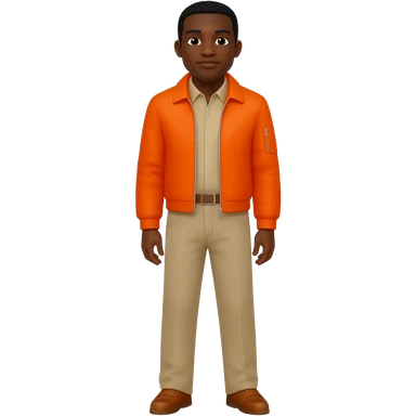 Black male orange jacket and beige shirt and pants brown shoes black hair emoji
