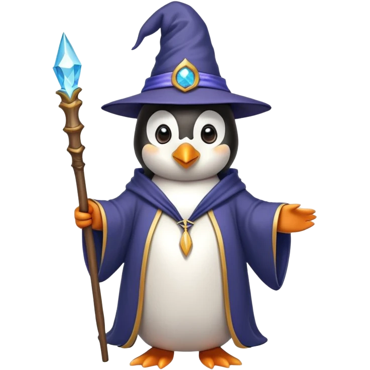 A penguin wearing a wizard hat and robe, holding a magic wand emoji