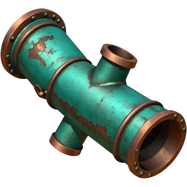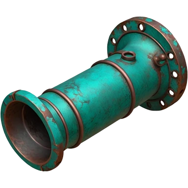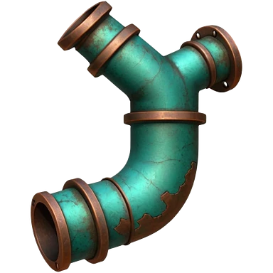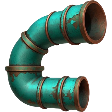 3D render of Garden Pipe, heavily oxidized copper texture, verdigris patina, Pipe joint with teal oxidation, weathered bronze aesthetic, ancient decay, emoji style, isolated on white background --v 6.0. emoji