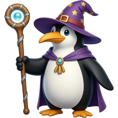 penguin wizard, magical, holding a staff, wearing a wizard hat emoji