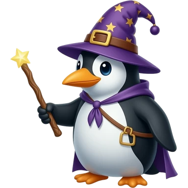 penguin wizard holding a staff wearing a pointed hat magical sparkles emoji