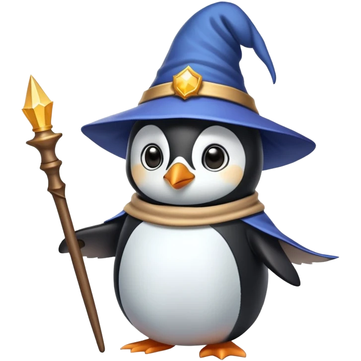 A penguin dressed as a wizard, holding a magic wand, with a pointy hat and a cape emoji