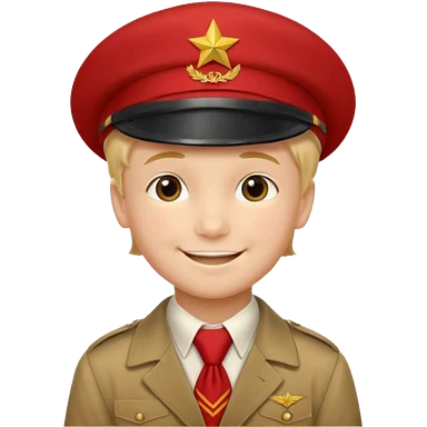 A Soviet pioneer emoji — smiling young boy wearing a white shirt with a bright red pioneer necktie and a classic red pilotka cap. The pilotka cap should fit closely to the head, without brims or side flaps, slightly folded at the top. not a cowboy hat. Flat, smooth 3D shading emoji