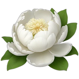 A white peony flower with green leaves in iOS 3D style, with a yellow center, detailed petals, and a realistic yet stylized appearance. emoji