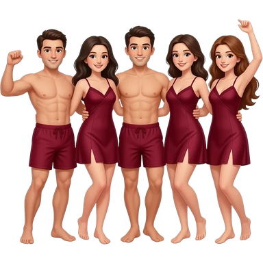 people dancing, total 6 people, 3 guys 3 girls, they are wearing dark red color nighty. emoji