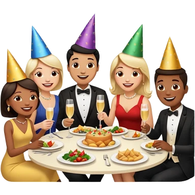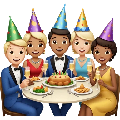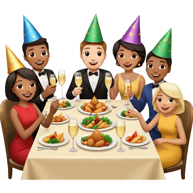 Family sitting on couch wearing Christmas hats. All with fat belly’s. Two people sleeping, one person burping. With Christmas dinner on floor. emoji