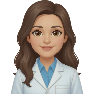 female scientist with long brown hair in white coat in text emoji emoji