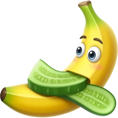 Un plátano con ojos y nariz y un pepino én la boca emoji