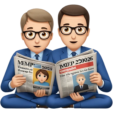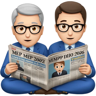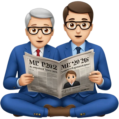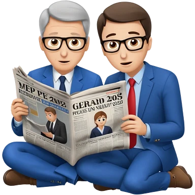 Gérard Larchet et yael braun pivet qui sont assis à genoux et qui lisent un seul et même grand journal et qui semblent émerveillés sur le journal on peut voir marque MEP 2026 au,milieu d’un article emoji