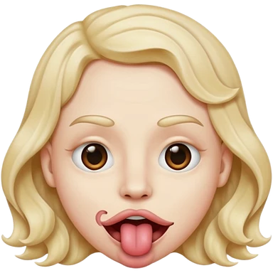 una chica de 18 años sacando la lengua con los labios con pintalabios nude y los ojos maquillados, de piel blanca con el pelo liso, largo y pelirrojo, ojos marrones emoji