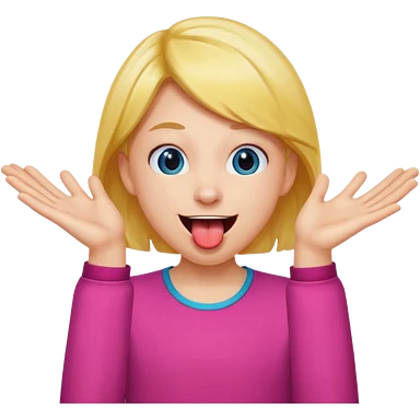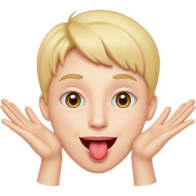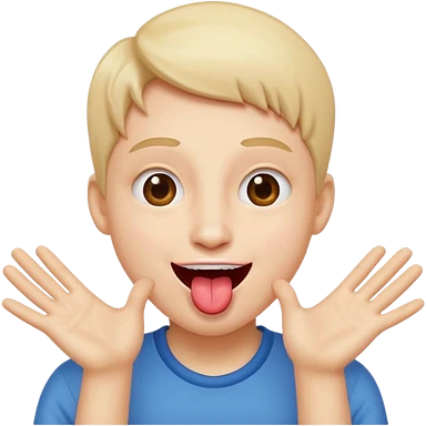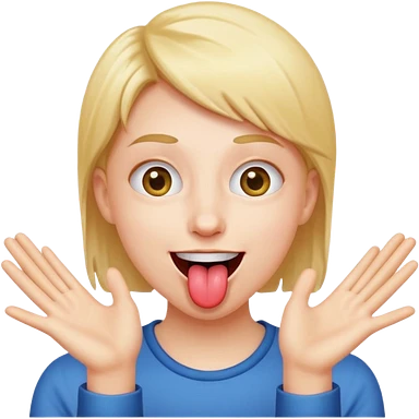 pessoa fazendo careta, com sorriso divertido, língua pra fora e mãos abertas próximas ao rosto emoji